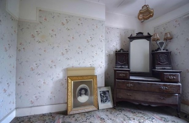 À l’intérieur, le décor semble figé dans une autre époque : meubles d’époque, objets personnels disposés comme si les habitants étaient partis en un clin d’œil. Pourtant, la poussière accumulée et les papiers peints en lambeaux trahissent une longue absence, révélant un départ brusque et inexpliqué.