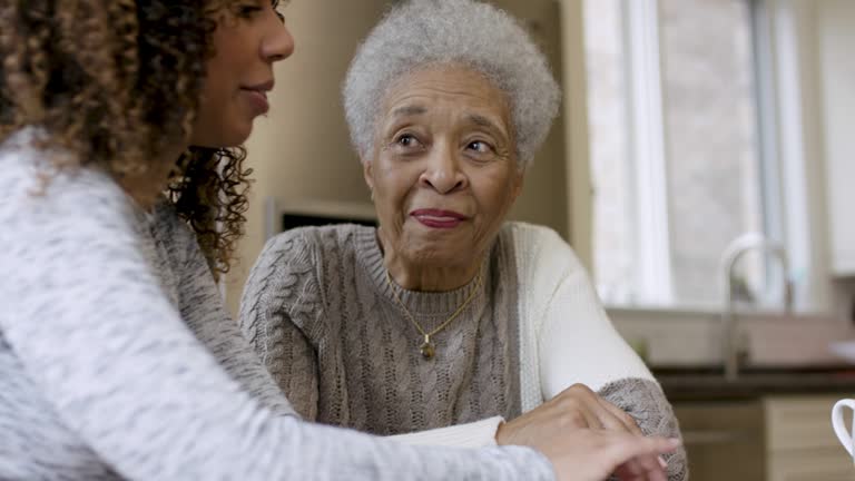 A beautiful adult female is helping her grandma learn how to use a computer